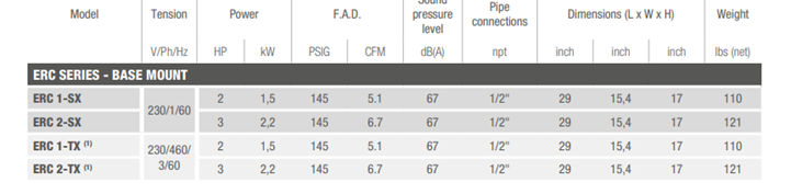| Model | Max Operating Pressure | F.A.D. | Sound Pressure Level | Power | |||